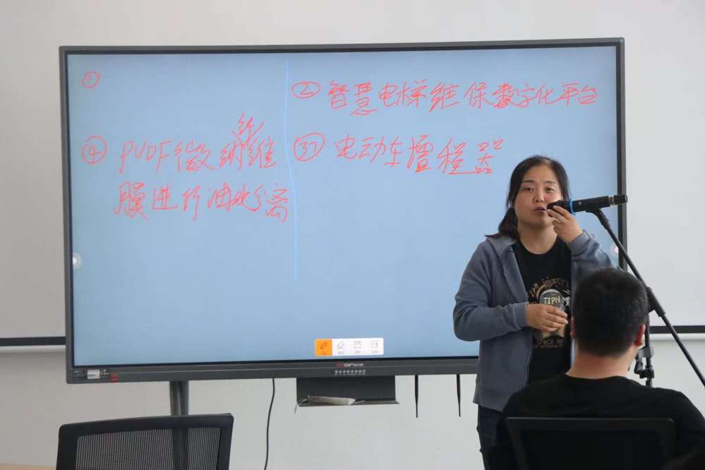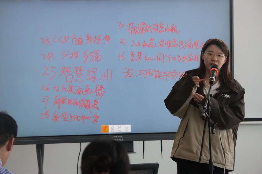 会前,系办公室提前一周部署了每位教职工思考日常生活中的痛点以及自己的奇思妙想,记录下天马行空的想法、深度挖掘想法的创新点,形成自己的创客项目。40位教职工在主题创客周活动上轮流上台汇报了个人创意项目名称和具体创新点,并在白板上按序号顺序标注了创客项目名称。教职工的创意想法涵盖了日常家居用品、专业教学器材、公共环境设施、智慧交通出行等方面。