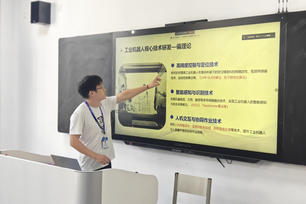 会上,张雪翔为大家详细阐述了机电教研室当前的三大核心科研方向:第一,工业机器人方向。该方向将聚焦于工业机器人核心技术研发、系统集成与应用等领域。第二,电梯方向。该研究将涵盖电梯驱动、控制、材料与结构、电梯智能化与自动化以及电梯节能环保等多个方面。第三,航天特色方向。结合我校的航天特色,教研室将探索卫星制造与组装中的工业机器人应用,为航天领域的智能化、自动化发展贡献力量,助力我国航天事业的蓬勃发展。随后,张雪翔介绍了多种实用的科研工具,包括论文检索平台、算法验证软件以及科研制图工具等,这些工具将有效提升教师的科研效率与质量,助力科研工作的顺利开展。