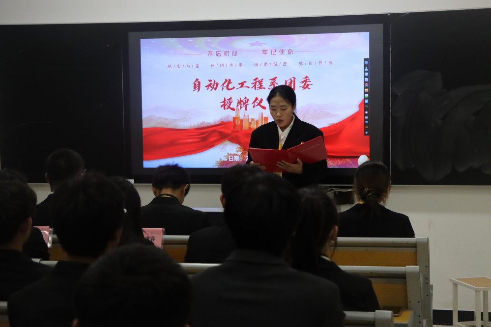 此次授牌仪式的圆满举行,既是职责与责任的象征,更是一种认可与殷切期望。自动化工程系团委全体成员将以青春之名,不忘初心、赓续使命,践行担当,努力在新的岗位上绽放光彩,为自动化工程系的辉煌未来奋力拼搏!