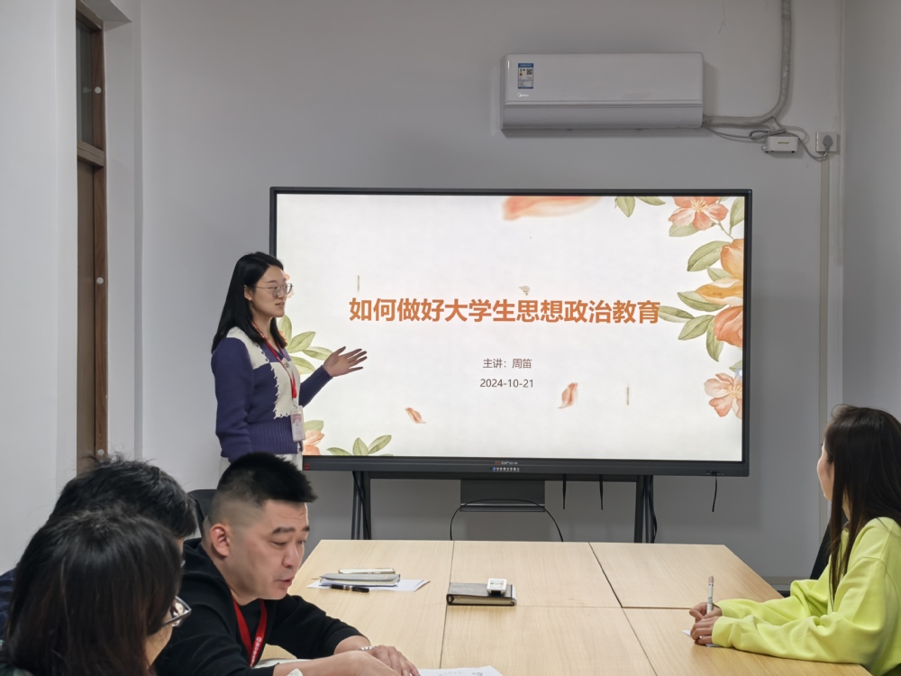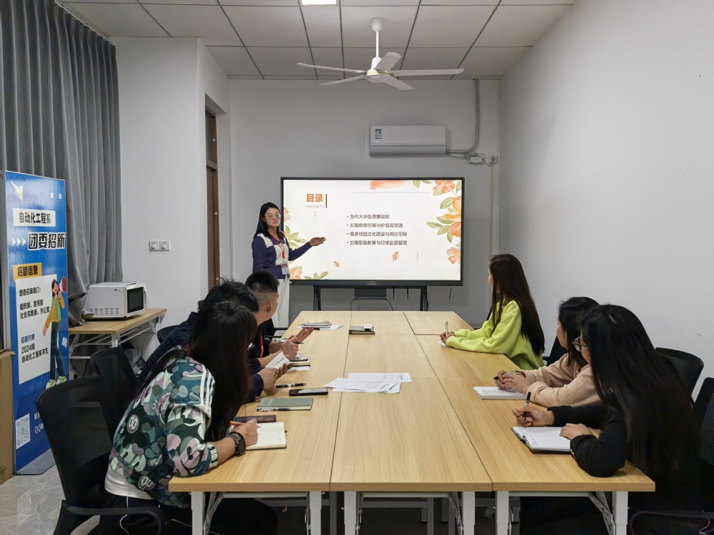 为进一步探索和优化大学生思想政治教育的路径与方法,提升教育工作的实效性和针对性,10月21日,自动化工程系在敏行楼405围绕“如何做好大学生思想政治教育”这一主题展开了深入而富有成效的讨论。本次辅导员业务研讨由周笛主讲,全系专职辅导员共同参与。