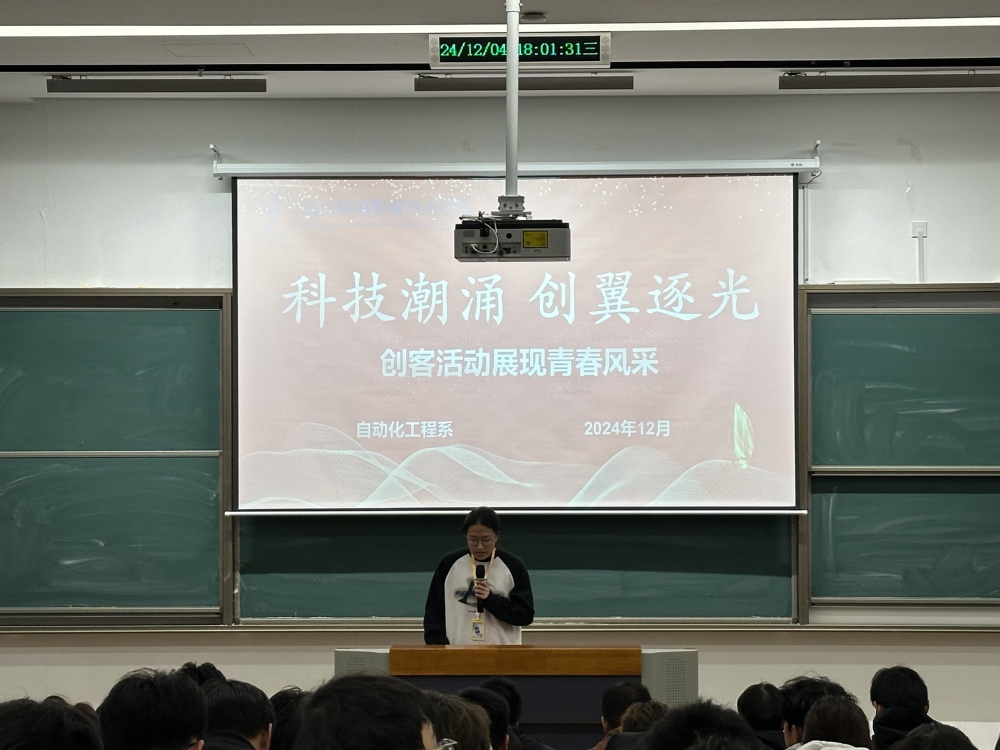 为培养学生创新思维,促进科技成果与转化应用,树立科技强国、科教兴校的理念,12月4日,自动化工程系在善学楼103举办了“科技潮涌,创翼逐光”创客周活动。本次活动由自动化工程系团委兼职副书记郑梦洁主持,系部专业负责人、各项目组学生成员以及团学组织学生干部参与其中,现场气氛热烈。
