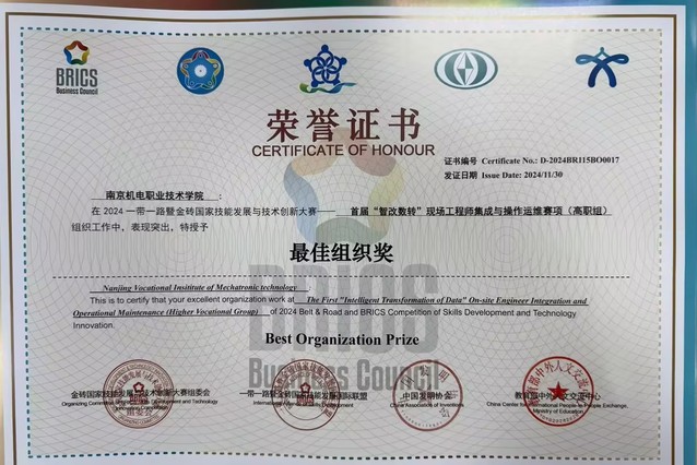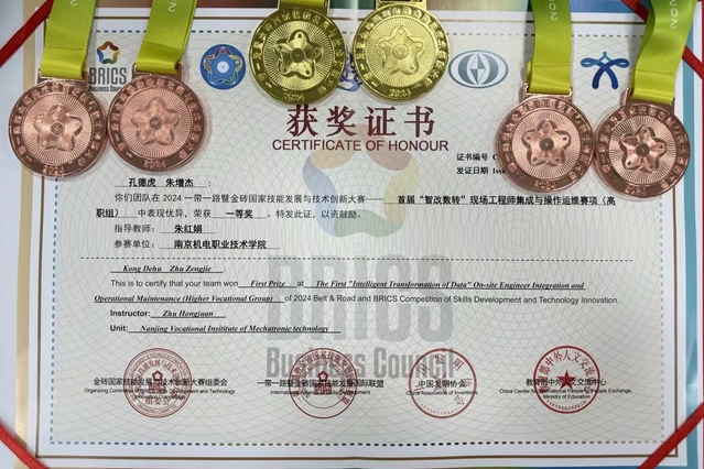 近日,2024“一带一路”暨金砖国家技能发展与技术创新大赛首届“智改数转”现场工程师集成与操作运维赛项全国决赛圆满收官。我校自动化工程系2023级学生朱增杰、孔德虎团队在朱红娟老师的指导下斩获一等奖,指导教师朱红娟获评优秀指导教师,学校获颁最佳组织奖。