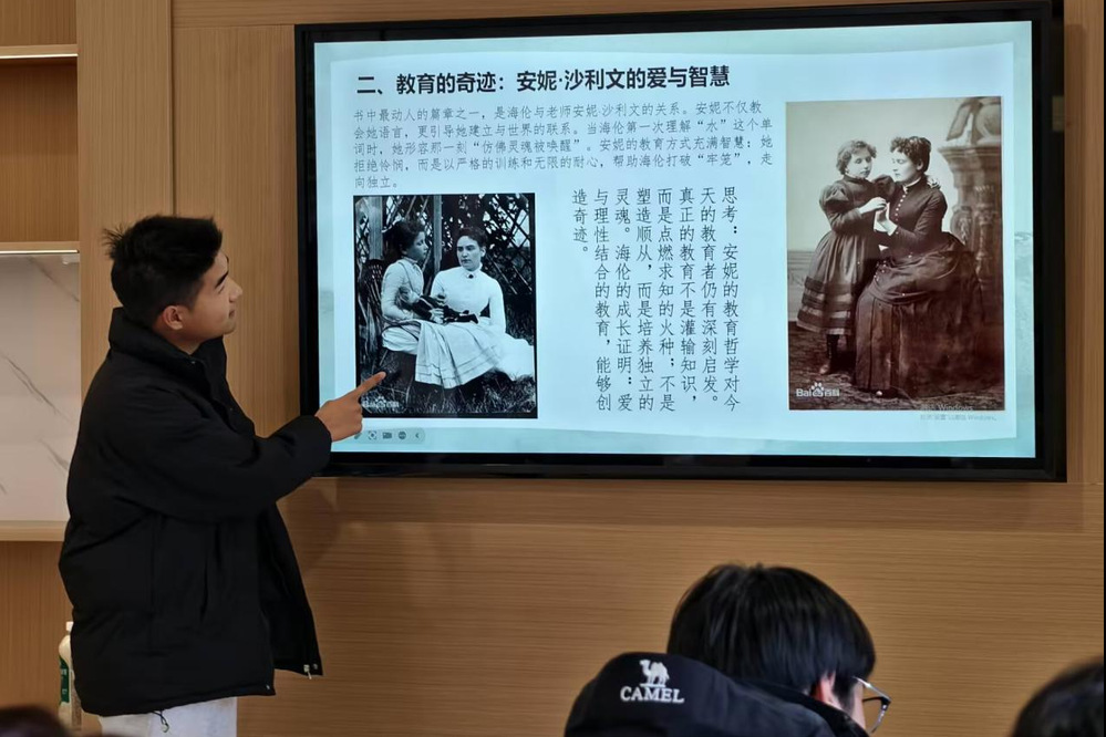 “黑暗将使人更加珍惜光明,寂静将使人更加喜爱声音。”活动中,主持人以海伦·凯勒的经典语录开篇,带领师生走进这位传奇作家用坚韧与希望铸就的精神世界。自动化工程系学生代表许威越、许浩泽、顾佳辉三位分享嘉宾,结合自身成长经历,从不同视角解读作品内涵。许威越以“逆境中的觉醒”为主题,剖析海伦·凯勒如何在感官的桎梏中重塑生命的价值;许浩泽通过“知识即光明”的视角,讲述阅读如何成为冲破迷茫的灯塔;顾佳辉则以“心向自由,步履不停”为切入点,呼吁同学们在平凡中坚守理想,用行动书写青春篇章。