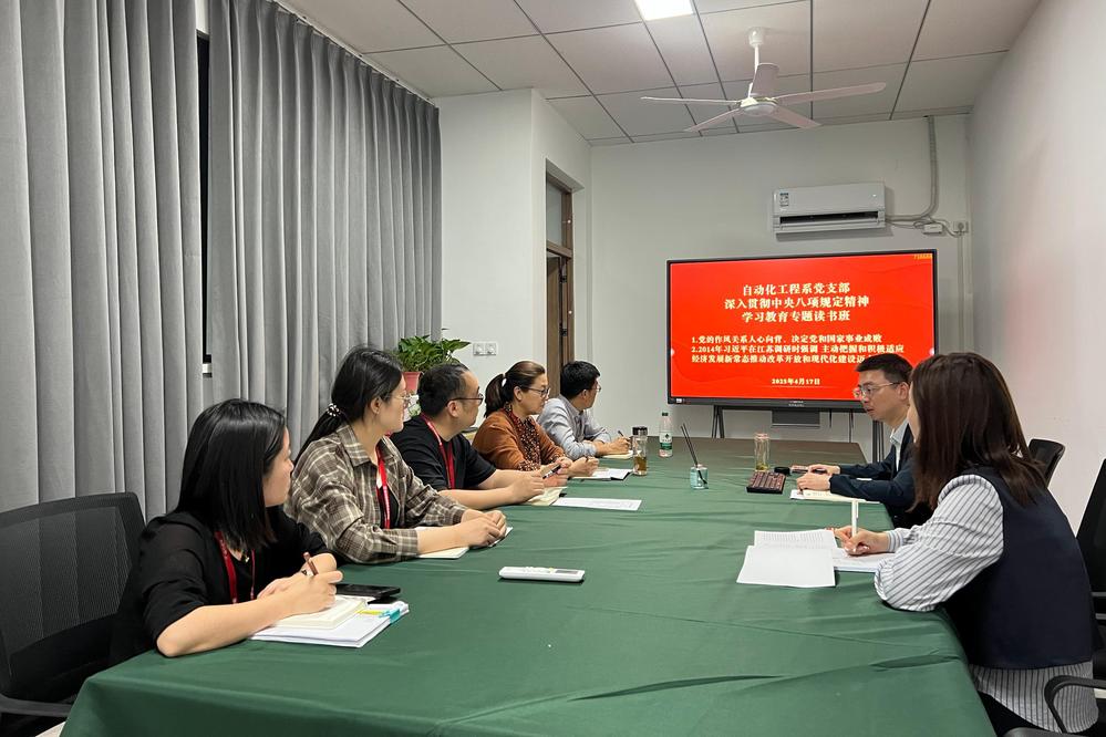 为深入贯彻落实党的二十届三中全会和中央八项规定精神学习教育部署,巩固拓展学习贯彻习近平新时代中国特色社会主义思想主题教育成果,巩固党纪学习教育成果,深化作风建设实效,4月17日,自动化工程系党支部在敏行楼405会议室开展深入贯彻中央八项规定精神学习教育读书班集中学习。系党支部副书记杨军、副主任张海红、副主任顾晟吉和支委会全体成员、专业负责人参加集中学习。