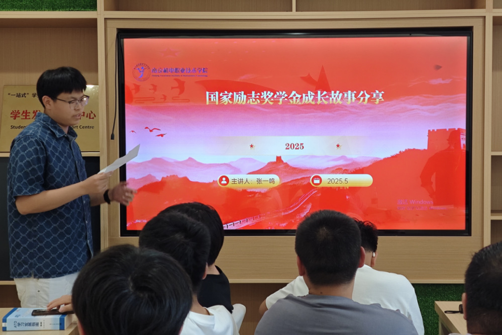张一鸣同学以《奋斗者,正青春》为题,从“专业学习、科技创新、社会实践”三个维度分享了成长历程。“国家励志奖学金不仅是物质支持,更是精神激励的里程碑。它时刻提醒我,唯有持续奋斗才能浇灌出理想之花。”谈及获奖感受时,他特别提到疫情期间参与社区志愿服务的经历,“当看到专业所学能切实解决防疫设备的调试难题,我深刻体会到知识报国的真谛。”通过展示专业竞赛获奖证书、社会实践影像资料,他生动诠释了“将知识转化为力量,让青春绽放担当”的成长理念。