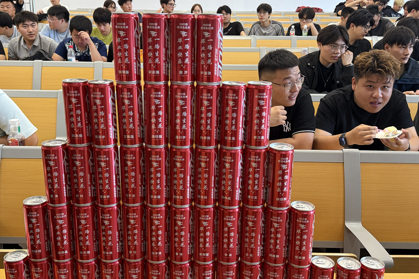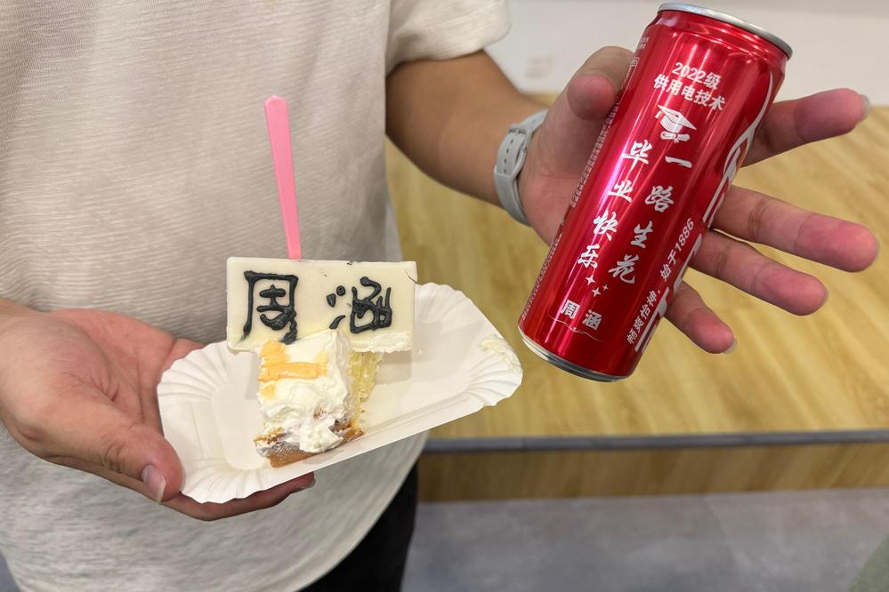 在善学楼分会场,毕业班辅导员在分会场的教室给毕业生开展了毕业前的最后一堂班会,给三年的大学生活画上了圆满的句号。辅导员袁佳特别给毕业生们准备了定制姓名可乐、毕业蛋糕等场景,为毕业生的大学青春留下独特的记忆。于靖欢老师为毕业生详细讲解了国家资助政策,重点对办理助学贷款的学生进行了诚信教育,强调按时还款的责任与义务。