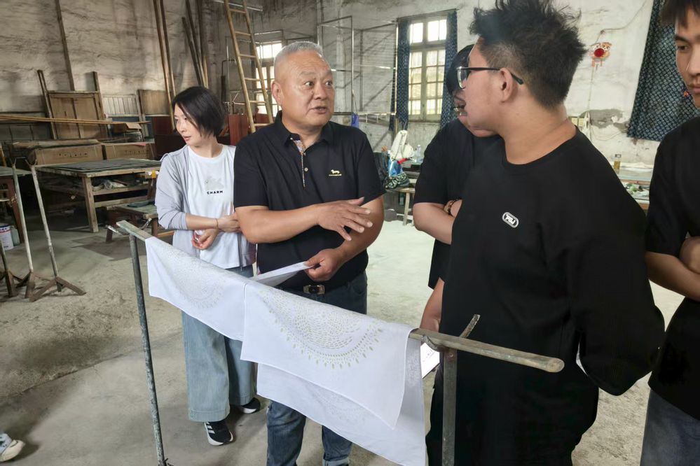 体验了古老的印染技艺,领略了深厚的文化积淀,团队成员们跃跃欲试,渴望将这份“蓝白之美”融入生活。在老师傅们的指导下,大家开启了蓝印花布创意手工体验环节。